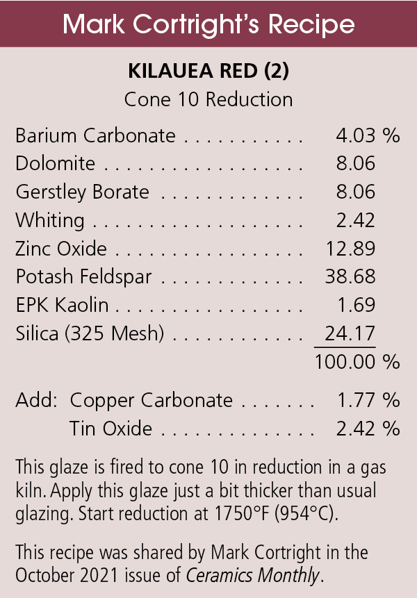 Red hues, like those found in Misty Gamble’s Partridge Plymouth Rock, can be natural, elusive, or shocking depending on their use, tone, or atmosphere. Below are a handful of reds to try in your next firing.