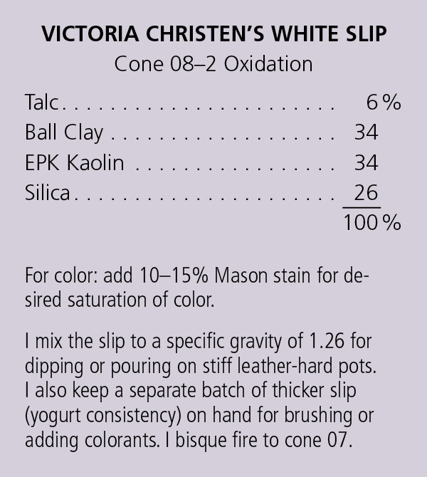 Make a few sketches of your finished form to explore surface design options. When the pot is stiff leather hard (applying slip past this stage may cause it to pop off after the glaze firing), I dip it in a bucket of thin, white slip (see recipe at right) that allows my red earthenware clay to show through after the glaze firing (15). Brush marks can leave interesting patterns that also permit the underlying clay to show through, so you could brush on a thicker slip instead of dipping. Once the white slip dries, I paint gestural botanical motifs using colored slips (16). After decorating, check that slip isn’t blocking the hole you made earlier with a needle tool. Once the work is bone dry, I bisque fire to cone 07 and glaze fire to cone 2 in an electric kiln.